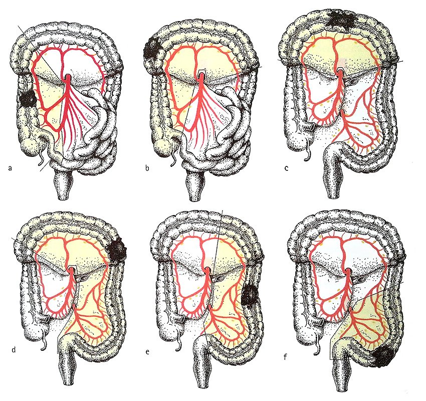 Je nach Tumorlokalisation werden bestimmte Darmabschnitte samt Gefäßversorgung und Lymphabflußgebiet entfernt.