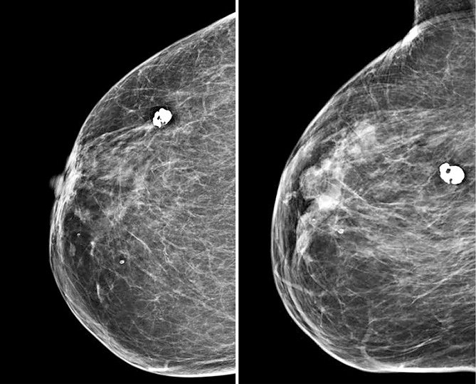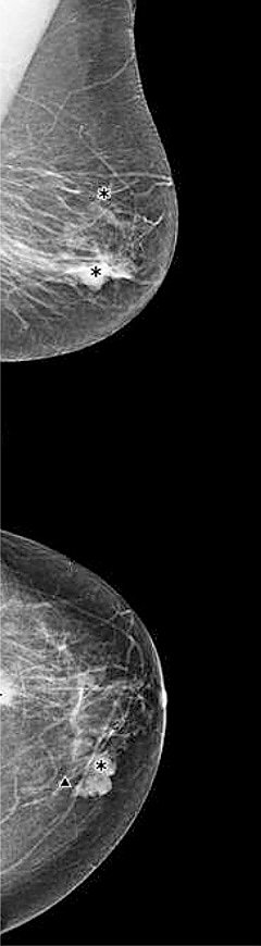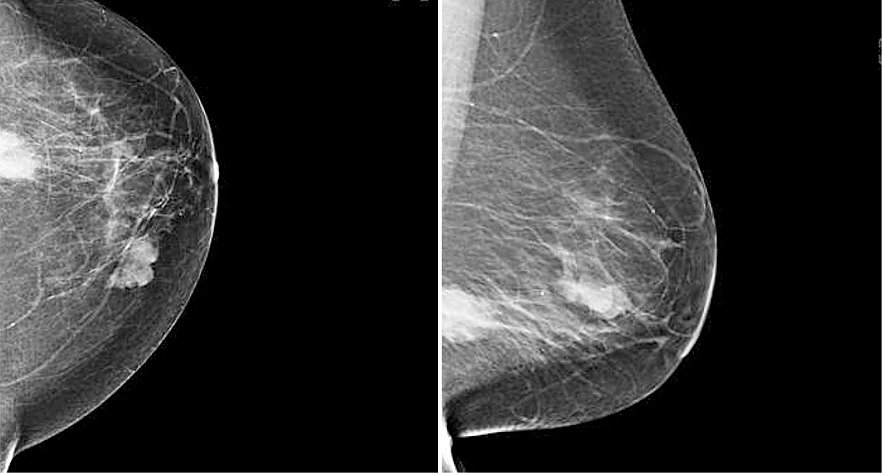 Die Mammografie ist ein Röntgenverfahren, das unter der Nutzung der charakteristischen Strahlung Schwächungsbilder der Brustdrüse erstellt, was üblicherweise in 2 Ebenen erfolgt (sog. CC und MLO-Aufnahme). Die Nutzung direkt-digitaler Systeme ermöglicht hier eine substantielle Reduktion der Strahlendosis von bis zu 40% im Vergleich zu Geräten, die erst im Nachgang ein digitales Bild erstellen oder analog verbleiben. Wir haben ein selenbasiertes Mammografiegerät in der Anwendung als einzigem entsprechend hochwertigen System in Nordthüringen und können so sehr dosissparend arbeiten. Außerdem sind bei uns 4 Röntgenassistenten nach entsprechenden Kursen als Mammafach-MTRA zertifiziert. Wir sind Partner verschiedener Brustzentren und führen im Jahr ca. 1500-2000 Mammografien durch im stationären und ambulanten Bereich. Alle Frauen mit einem Überweisungsschein und einer entsprechenden Indikation (beispielsweise einem Tastbefund oder einseitigen Schmerzen). Ein Mammakarzinom kann als Verdichtung strahlenförmig imponieren, aber auch als vielgestaltig gruppierter Mikrokalk (polymorpher Mikrokalkcluster) sowie in seltenen Fällen als Architekturstörung (siehe Beispielbilder). Ergänzend zu einer Befundung durch 2 Radiologen werden bei uns auch computerunterstützende Systeme verwandt, um eine zusätzliche Analysemöglichkeit zu entwickeln. Über diese Problematik wurden schon zahlreiche Publikationen von Prof. Malich verfasst.