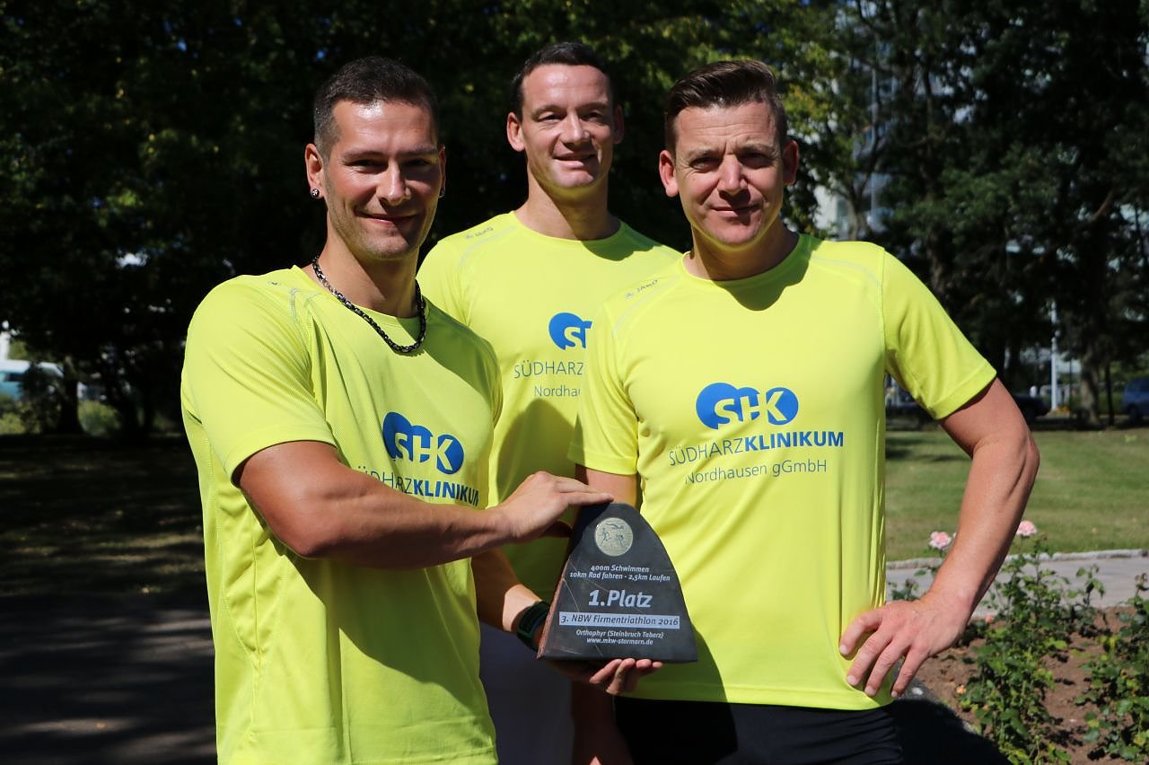 Bei der zum dritten Mal ausgetragenen Firmenstaffel starteten diesmal 31 Dreier-Teams. Der Sieg ging an das Südharz Klinikum – vertreten durch unsere Mitarbeiter Uwe Fabian (Schwimmer), Karsten Hoffmann (Radfahrer) und Sebastian Hartmann (Läufer).