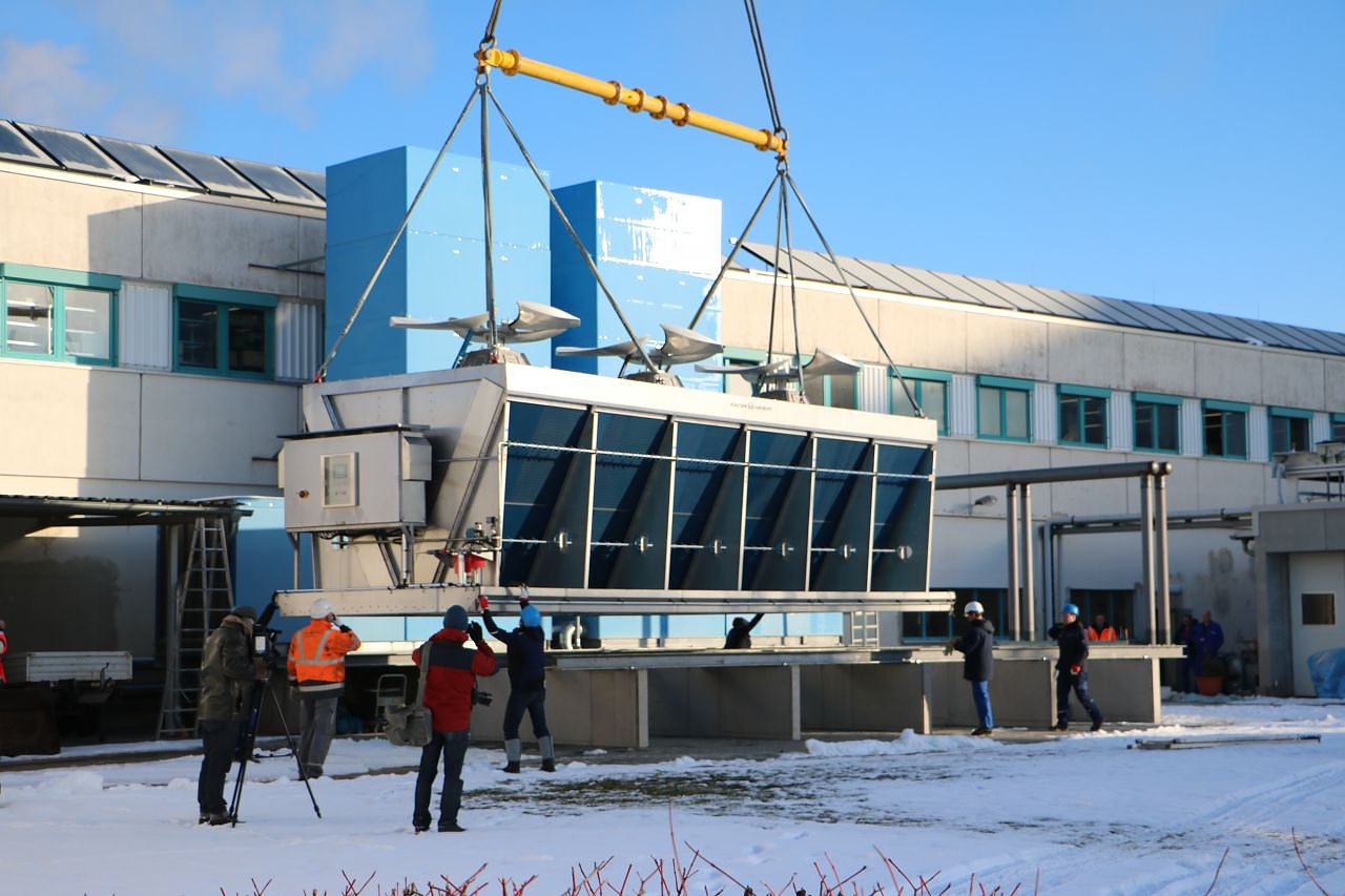 Ein 12 Tonnen schweres Kälteaggregat wurde am Dienstag mit Hilfe eines Spezialkrans auf dem Gelände des Südharz Klinikums postiert. Bei winterlichen Außentemperaturen musste der 10,60 Meter lange und 3,20 Meter breite Koloss über das Gebäude der Technikabteilung gehoben werden.