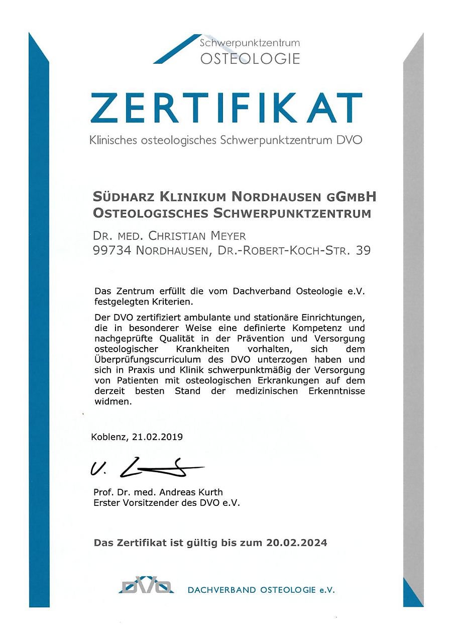 Der Dachverband für Osteologie (DVO) hat im Februar 2019 das Osteologische Schwerpunktzentrum am Südharz Klinikum Nordhausen zertifiziert. Der DVO zertifiziert Arztpraxen und Kliniken, die über besondere Erfahrungen in der Prävention und Versorgung osteologischer Patienten verfügen.
