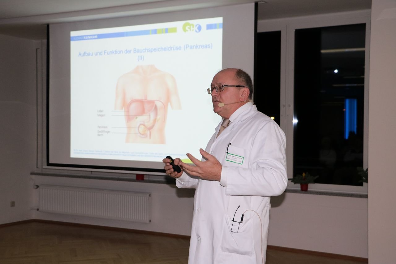 Zunächst nannte Gebhardt interessante Fakten über das nur 150 Gramm schwere Organ, das weit hinten im Bauchraum liegt, eingebettet in den Zwölffingerdarm. So produziert die Drüse am Tag bis zu 800 Milliliter Sekret für die Verdauung der zugeführten Ernährung des Menschen. Darüber hinaus schüttet sie Insulin und weitere Stoffe aus, die für den Hormonhaushalt wichtig sind.