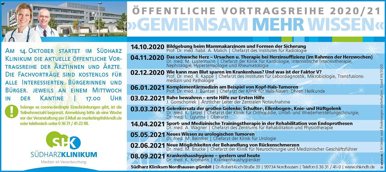 Seit 2013 werden im Südharz Klinikum öffentliche Vortragsreihen durchgeführt, die sich an Patienten, Angehörige und Interessierte richten. Die Termine sind einmal im Monat mittwochs jeweils ab 17.00 Uhr in der Kantine des Hauses. Dabei werden vielfältige Gesundheitsthemen, wie zum Beispiel Krankheitsbilder mit deren Früherkennung und Therapiemöglichkeiten, durch den jeweiligen Chefarzt bzw. Experten anschaulich erklärt. Im Anschluss an die Vorträge stehen unsere Referenten für individuelle Fragen zur Verfügung.